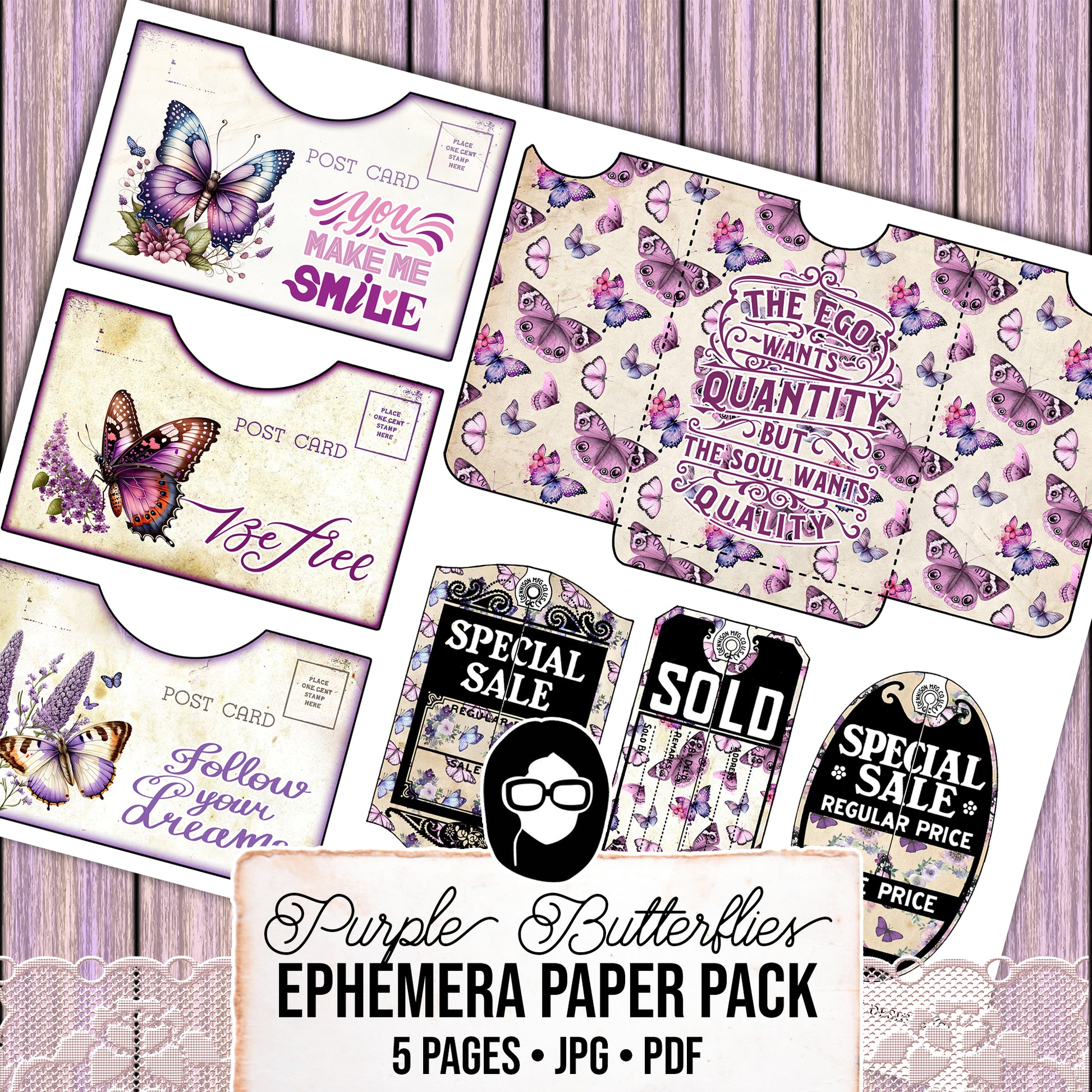 With this purple butterflies kit, you'll be able to print out ephemera with positive affirmations that focus on your strengths and abilities. Included are tags, postcards and journal cards to help get your creative juices flowing as well as a bunch of other goodies so that you can create the journal of your dreams. It's packed with quotes, and other goodies that will help you stay positive and motivated. You can create a journal for yourself, a friend, or perhaps even sell them at craft fairs.